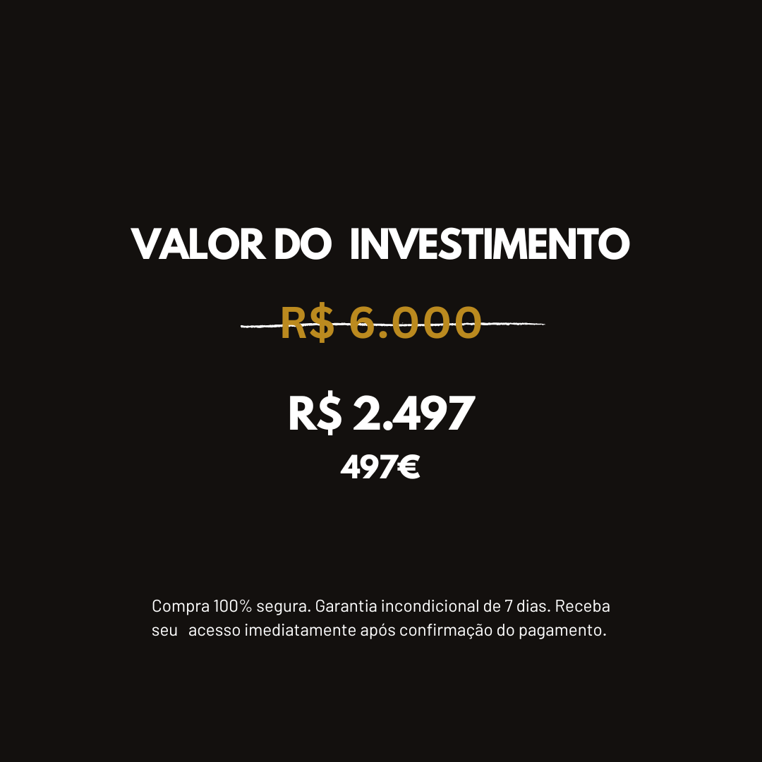 Garanta a sua vaga hoje e receba um desconto de três mil reais (novecentos euros) exclusivo para a primeira turma da Jornada do Básico ao Luxo. A partir da próxima turma não teremos esses bônus e o valor não será mais igual à esse.